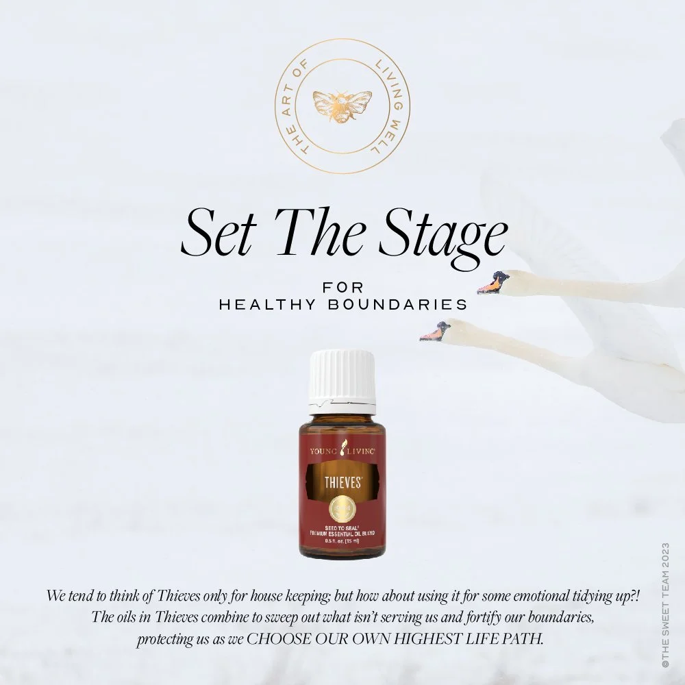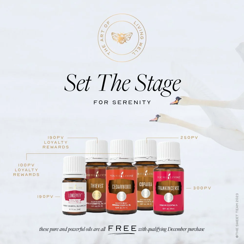 At this time of year, it is especially easy to surrender our power and lose our emotional footing. But it doesn’t have to be that way. We set the stage on which the great act of our life plays out. WE SET THE STAGE…for healthy boundaries, for truth, for release, for community, and for self worth. Whatever these mean for you, when they are set to your satisfaction, to your definition, what do you have? Serenity. It’s in your power. And of course, Young Living has selected the perfect gifts with qualifying purchase to accomplish this. The essential oils for December clear low frequencies and tidy up, making space for the emotions and vitality of living well.